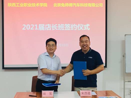 7月13日下午,我院与北京兔师傅汽车科技有限公司在崇文楼五楼汽车学院会议室举行订单班培养签字仪式。北京兔师傅汽车科技有限公司总经理宋烈进、陕西省区总经理蒋福超等企业代表,学院党委副书记田昊、校企合作处、汽车学院主要负责同志参加会议。会议由汽车学院党总支书记高亚宁主持。