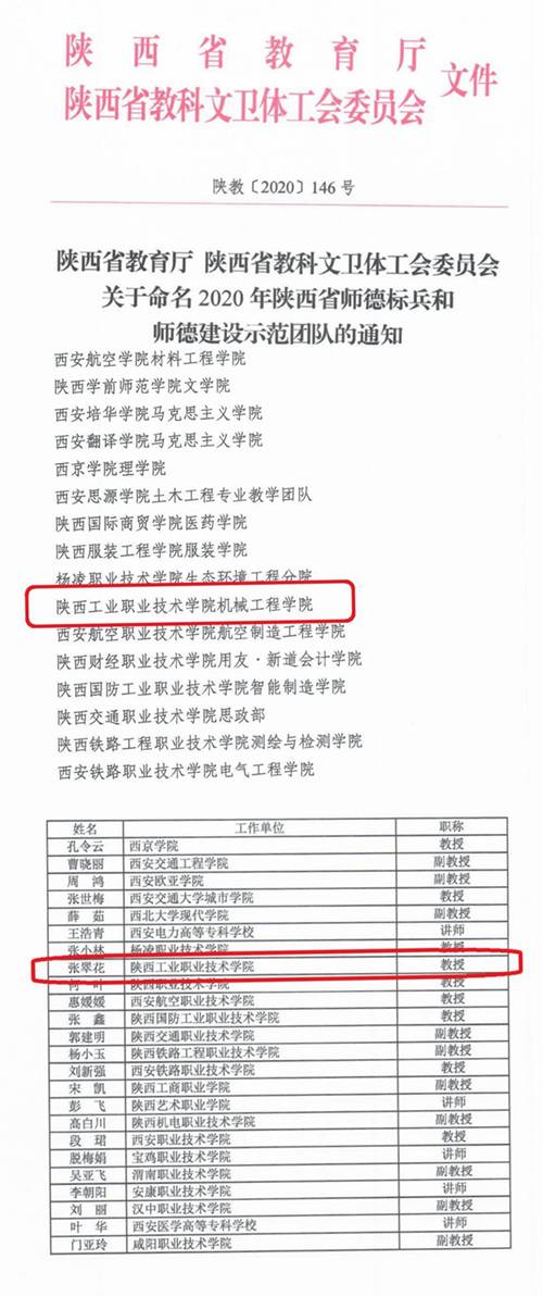 教师节前夕,陕西省教育厅、陕西省教科文卫体工会委员会下发《关于命名2020年陕西省师德标兵和师德建设示范团队的通知》(陕教[2020]146号),我校商贸与流通学院教师张翠花获得“陕西省师德标兵”称号,机械工程学院获得“陕西省师德建设示范团队”称号。