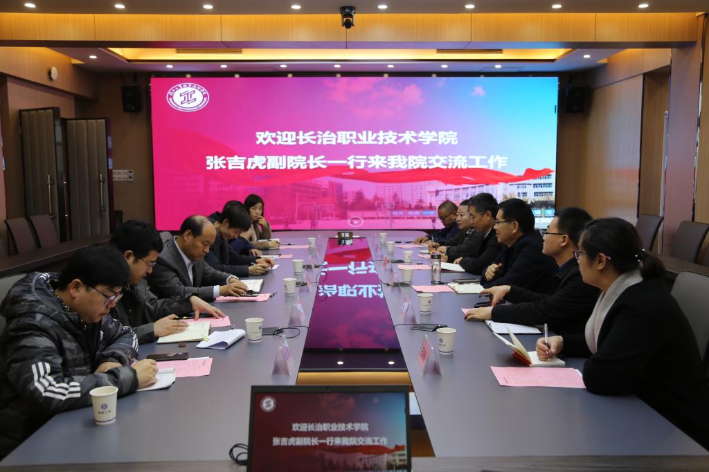 会上,梅创社副院长对长治职业技术学院张吉虎副院长一行的到来表示欢迎,邀请来宾一同观看了我院的专题片,并补充介绍了学院的发展情况,就来访嘉宾关注的“双高”建设方面做了重点介绍。张吉虎副院长对我院的热情接待表示感谢,对我院近年来在“双高”建设、产教融合等方面取得的成绩表示赞赏,并简要介绍了长治职业技术学院的基本情况,希望今后两校能加强联系、互相学习、共同发展。双方相关对口部门就“双高”推进措施、专业群组群逻辑、顶岗实习管理、产教融合、校企合作等方面的经验做法进行了深入的交流。